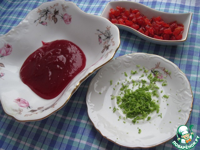 Вяленную вишню разрежем пополам, натрем цедру лайма. Отложим 130 грамм повидла.