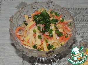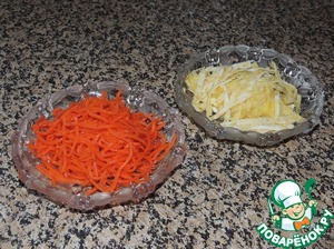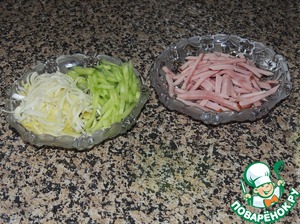 Охладить и порезать яичные блинчики такой же соломкой, что и окорок. Морковку взять готовую или приготовить самим.