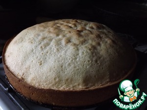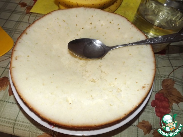 Остывший бисквит разрезать так, чтоб получилось 2 коржа.