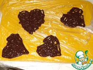 На разделочную доску надеть пакет. Шоколад переложить в пакетик или кондитерский шприц и тонкой струйкой нарисовать сердечки. Отправить в морозилку на 10 мин.