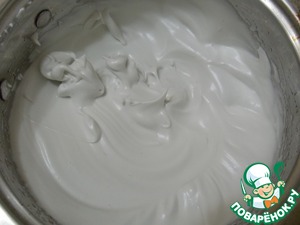 Пока варится сироп, мы начинаем взбивать белки, и как только сироп будет готов, вливаем его при взбивании в белки. Взбиваем до твердых пиков и пока безе не остынет. -