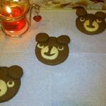 Противень застелить пекарской бумагой, смазать растительным маслом, выложить круги из теста, из подготовленных тёмных кусочков теста сформировать "уши", кусочки светлого теста раскатать в круг и выложить на тёмное тесто. Так же оформить и светлых "мишек". Из светлого и тёмного теста сформировать "глаза", из тёмного теста сформировать "нос" и "рот". Выпекать печенье при температуре 170-180 градусов 15-20 минут в зависимости от духовки, нужно следить за тем, чтобы светлое печенье сильно не зарумянилось.