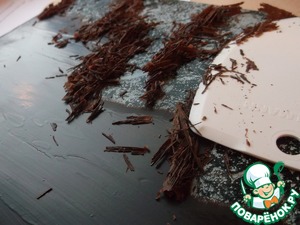 Тем временем шоколад на доске (противне) уже затвердел, и мы можем с помощью шпателя снять тонкую стружку.