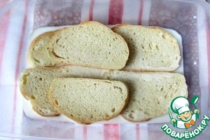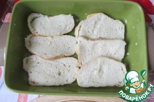 Форму для запекания смазать растительным маслом, ломтики хлеба слегка отжать и уложить слоем в форму.