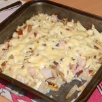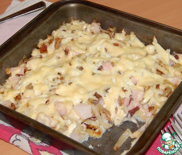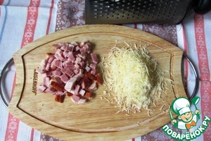 Окорок (или ветчину, грудинку, бекон, колбасу) нарезать мелким кубиком, сыр натереть на мелкой терке.