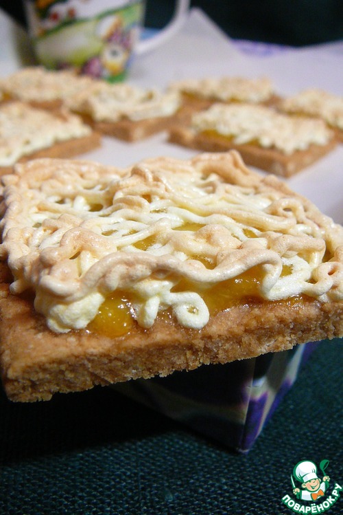 • Смазываем основу из печенья любым вареньем, покрываем взбитым белком (количество по желанию) и в разогретую духовку, пока белок основательно не зарумянится (180-200 С, верхний/нижний нагрев. В моей духовке это минут 15). Если остается белковая масса, я отсаживаю безешки. Вот, по сути, и все! Быстро и вкусно!