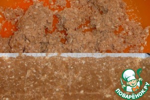 • Хорошенько все размешиваем и формируем пласт. Несмотря на внешнюю "несобранность", масса нормально трамбуется. Укладываем ее как можно плотнее. Разрезаем пласт на мелкие кусочки прямо в форме.