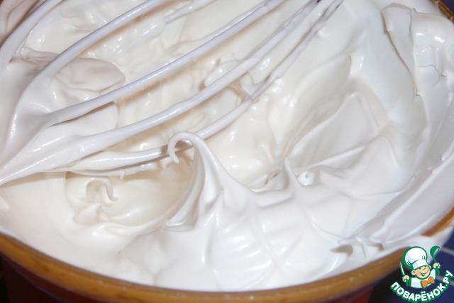 • Взбиваем белок с сахаром. Взбиваем, пока масса не станет гладкой, блестящей, перламутровой. Этот самый перламутровый блеск верный признак того, что белок достиг нужного состояния.