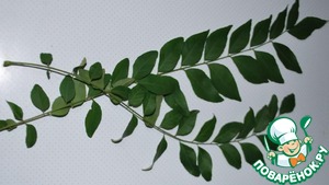 Вот так выглядят веточки с листьями карри. Они, кстати, не имеют никакого отношения ко всем известной смеси специй карри. Конечно, их очень сложно найти в магазине, но мне повезло – у меня этот кустарник растет прямо во дворе.