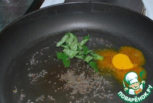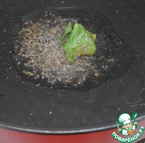 Налить 1 ч. л масла на сковороду, обжарить семена горчицы и листья карри на среднем огне в течение минуты после того, как семена начнут потрескивать и лопаться.
