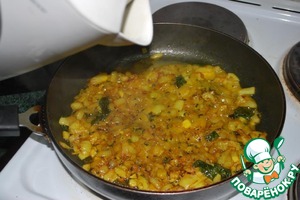 Когда они начнут трещать и лопаться, добавить к ним порезанный лук, листья карри и куркуму. Для желающих возможен вариант с небольшим количеством зеленого чили. Обжаривать минут 5-10 до готовности лука.