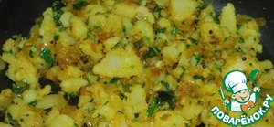 После этого добавить размятый картофель, рубленую кинзу и перемешать.