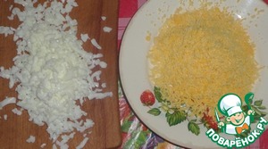 Белки натереть на крупной терке, желтки на мелкой.