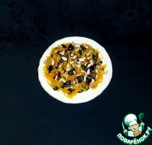 На середину круга, чуть отступив от краёв, выложить немного начинки и посыпать семечками.
