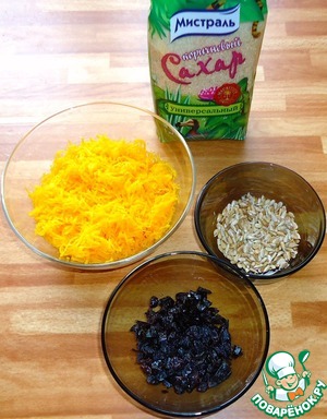 Для начинки тыкву (или яблоки) очистить от кожуры и семян, натереть на средней тёрке, изюм или чернослив (у меня был и изюм и чернослив) промыть, залить кипятком, оставить на 10-15 минут, затем слить воду и мелко нарезать чернослив, семечки подсолнуха слегка обжарить на сухой сковороде и очистить. Для приготовления слоек я использовала универсальный коричневый сахар ТМ "Мистраль".