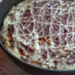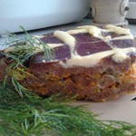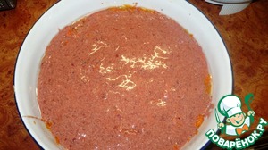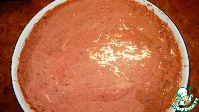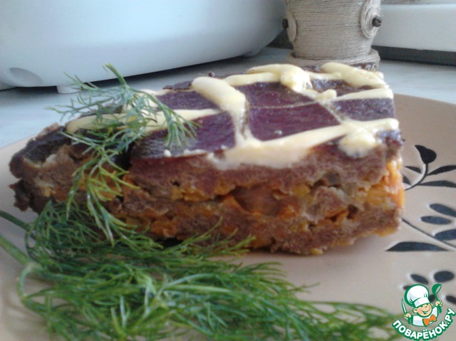 В оригинале рецепта рекомендуется смазать верхний слой майонезом, но так как печень жидковатая, майонез в ней просто утонул кусками. Я бы посоветовала сделать частую сеточку майонезом или последний печеночный слой смешать в миске с майонезом, а потом уже выкладывать в форму. Ставить запекаться в духовку при температуре 180-200 градусов на час.