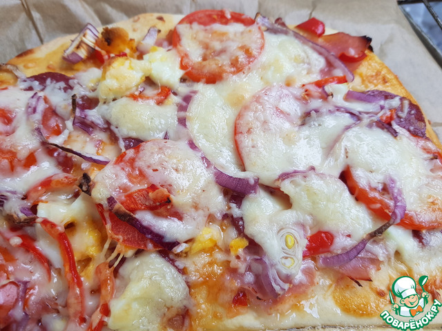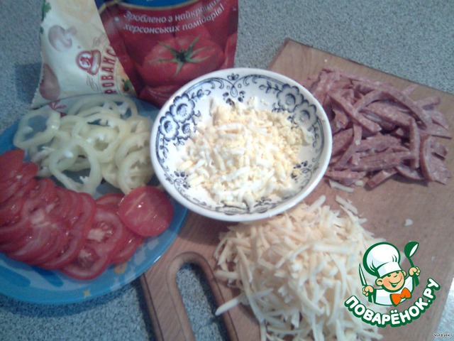 Смазать кетчупом, майонезом и выложить сверху начинку в произвольном порядке.