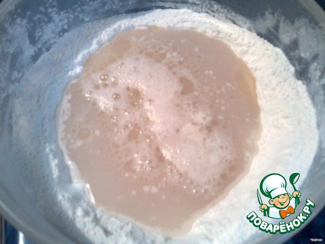 Смешать муку с солью, добавить масло, смесь с дрожжами и оставщуюся воду.