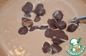 Масса должна стать светлой и достаточно густой. Добавим половину растопленного шоколада и ликёр, затем 150 мл. сливок и кофейные зёрна в шоколаде.