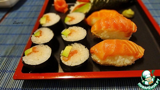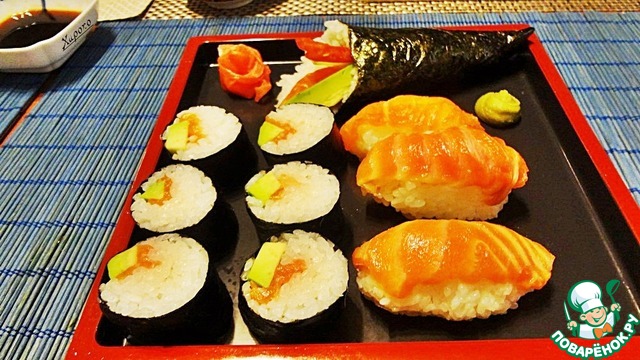 Вообще-то, в Японии принято этот вид суши готовить каждому самостоятельно. Для этого на стол подают отдельно заправленный рис, овощи, нарезанные соломкой рыбу или другую начинку.