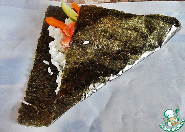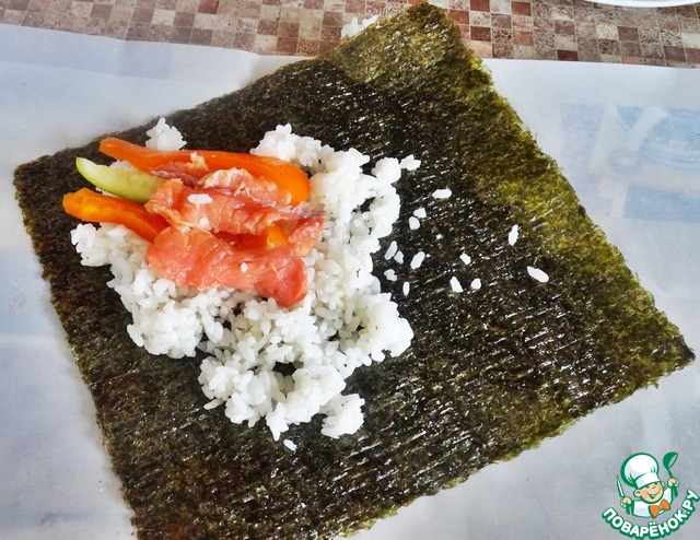 Лист нори кладут на руку, накладывают туда рис, немного васаби, овощи и рыбу. -