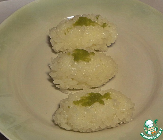 Для приготовления нигири-дзуси нужно взять половину столовой ложки заправленного уксусом и вином риса. Осторожно прижмите рис, чтобы получился такой колобок, как на фотографии. Сверху положите немного васаби. Кстати, васаби можно втереть и в рыбу, которую вы положите на рис.