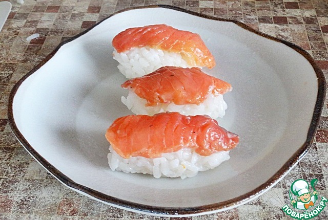 Отрежьте острым ножом тонкий слайс рыбы величиной чуть больше, чем колобок риса. Hа эту рыбу положить колобок риса и прижать руками так, чтобы рыба плотно облегла рис и получился такой холмик, как на фотографии.