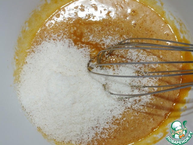 Добавить кокосовую стружку, размешать, затем всыпать муку, размешать