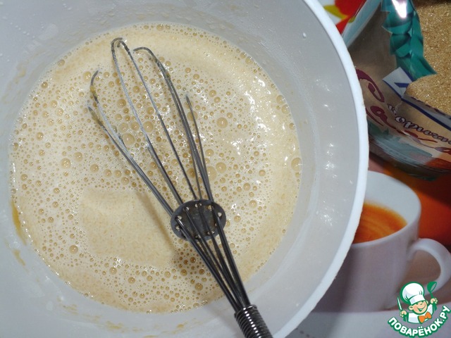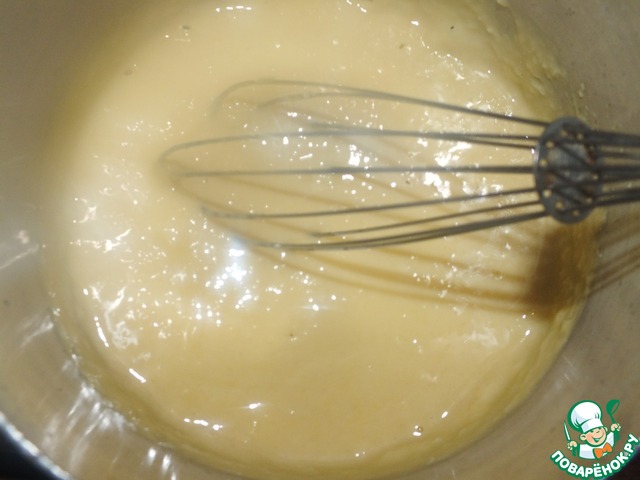 Молоко нагреть и влить в яичную массу, хорошо размешать венчиком, чтобы не образовались комочки