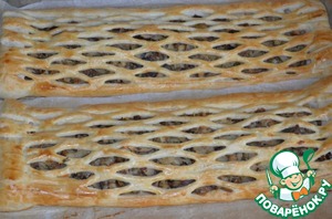 На край слоёного теста (оставляем с трёх сторон парочку сантиметров) выложить уже готовый фарш. С помощью вот такого приспособления сделать надрезики.