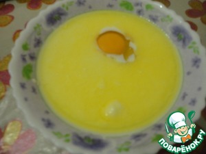 Сливочное масло растопить, добавить молоко, яйцо и несколько капель миндальной эссенции, хорошо взбить вилкой.