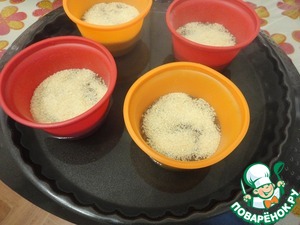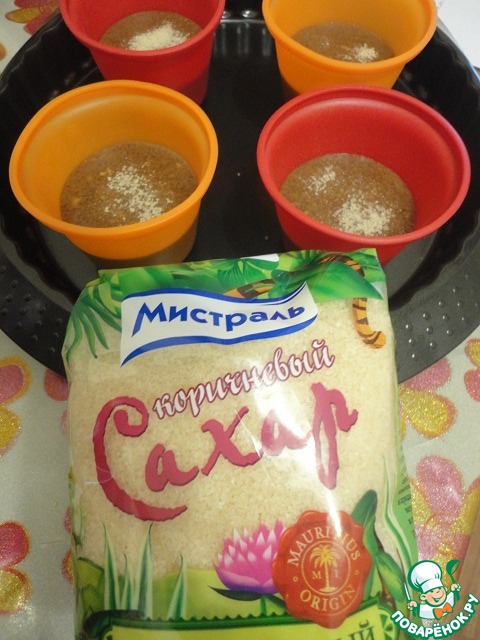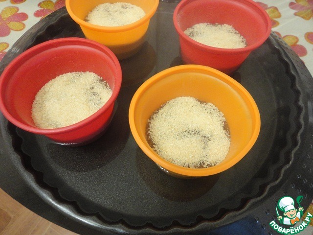 Разлить массу в формочки, сверху посыпать оставшимся сахаром.