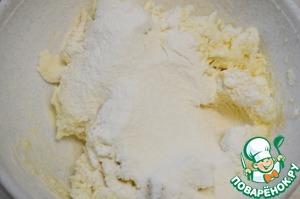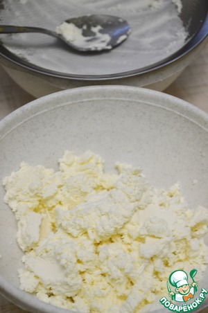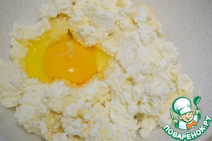 3. Муку просеять и добавить к творогу, замешивая тесто.