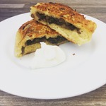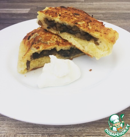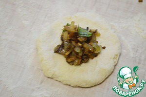 4. Из теста делаем небольшие лепешки, внутрь кладем начинку, формуем пирожки и обжариваем на сковороде до готовности.