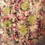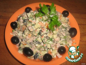 Маслины нарезать кружочками (у меня оказались маслины с косточкой, так что кружочки не получились, но вид салат не потерял).