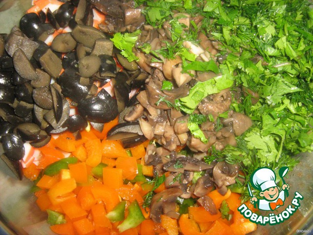 Грибы отварить (но можно и обжарить), нарезать не очень мелко.
