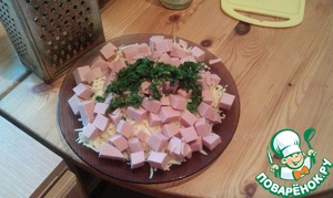 Сыр натереть на терке, мелко нарезать зелень. Колбасу нарезать ломтиками.