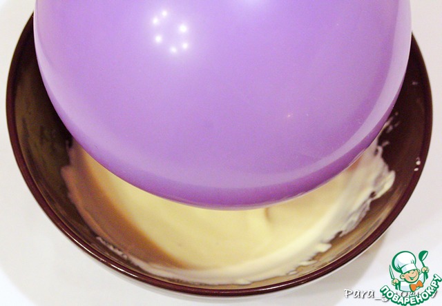 Надуйте шарик небольшого размера, вымойте и высушите его. Смажьте его нижнюю половину нейтральным маслом и опустите в растопленный шоколад, поворачивая шарик так, чтобы его нижняя часть по возможности равномерно покрылась шоколадом. Переверните шарик дном вверх, поставьте в емкость меньшего диаметра и отправьте в морозилку на несколько минут для застывания. Я использовала для этой цели балкон, благо там было -15. -