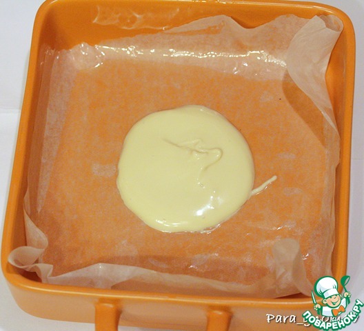 В емкость положите пергамент, смажьте его маслом. Ложкой выложите белый шоколад для основания чашечки.