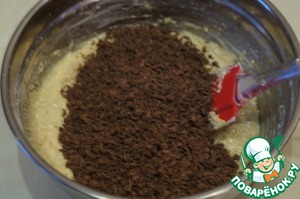Масло растопить, добавить сахар и взбить на низкой скорости. Вбить яйца, всыпать ванилин и все вместе еще раз взбить. Поочередно частями добавлять муку и сметану, после каждой порции взбивая тесто на низкой скорости. Когда все продукты будут вмешаны, всыпать шоколад и перемешать ложкой, чтобы он равномерно распределился по тесту.
