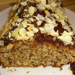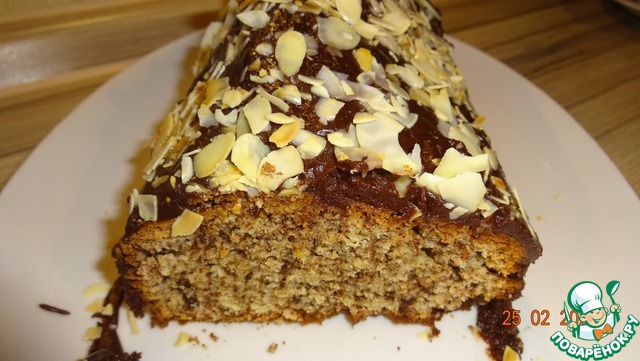 Готовый кекс вынуть из духовки, дать ему слегка остыть, затем извлечь из формы, полить шоколадной глазурью и посыпать миндальными хлопьями, слегка подрумяненными на сухой сковороде.