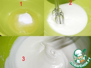 Безе: Взбить холодный белок с сахаром до образования пиков.