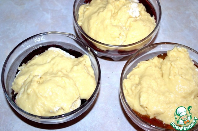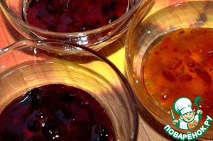 Выкладываем необходимое количество джема в три емкости. Если любите сладкую выпечку (очень сладкую), кладите джем по своему вкусу.