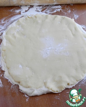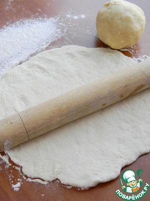 Стол присыпать мукой, раскатать тесто, которое со сметаной, не очень тонко.