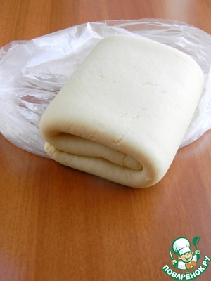 Сложить тесто конвертом, и снова раскатать в прямоугольный пласт, снова свернуть конвертом и раскатать. Такую процедуру повторить 3-4 раза. Муки я больше не подсыпала. Тесто превосходно раскатывается, не липнет к столу и скалке.