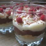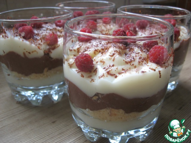 В креманки выкладываем слой из белого пудинга, сверху выкладываем шоколадный слой, на него — снова белый и т. д.