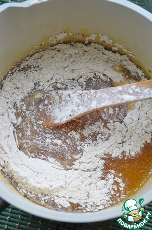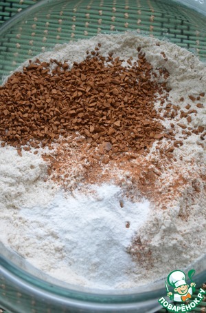 Муку смешать с разрыхлителем, добавить щепотку соли, корицу, кофе - перемешать