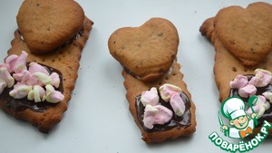 Кусочки маршмеллоу по одному накалывать на шпажку и нагревать над открытым огнем. От нагревания маршмеллоу начинает увеличиваться в размерах, как только это начинает происходить, зажать кусочек между двумя печеньями сердечком и прямоугольником. На край печенья нанести растопленный шоколад, посыпать измельченным маршмеллоу