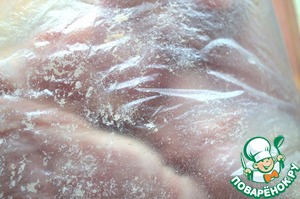 Теперь мясо надо сдобрить приправами, посолить и обвалять в муке. Опять-таки маленький совет - мясо кладем в пакет, в него - соль, приправы и муку. Пакет завязываем и энергично встряхиваем - все распределится равномерно и очень быстро.