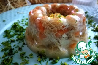 Перекладываем отбивные в форму, заливаем желе и ставим в холод до полного застывания.